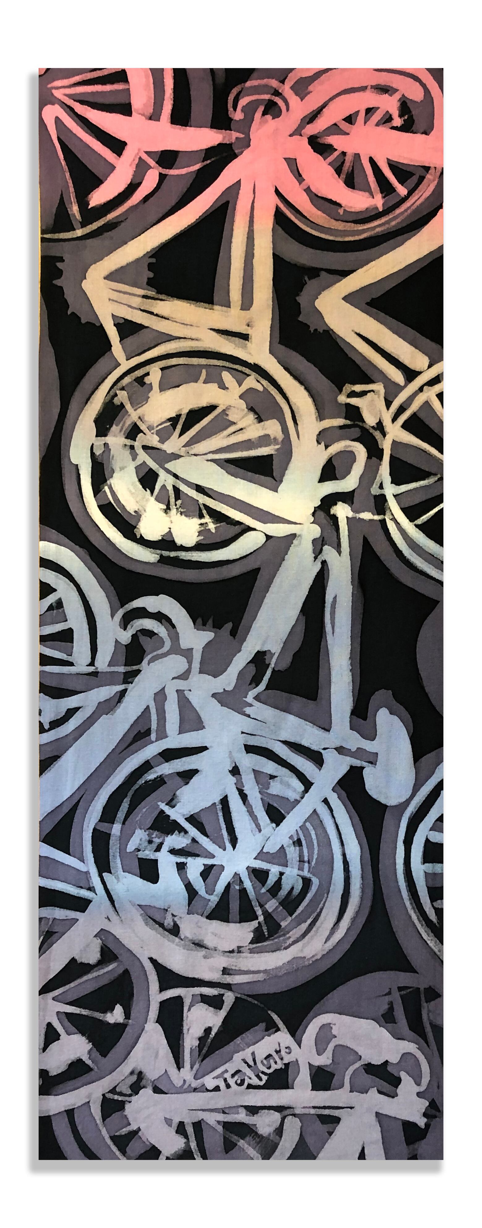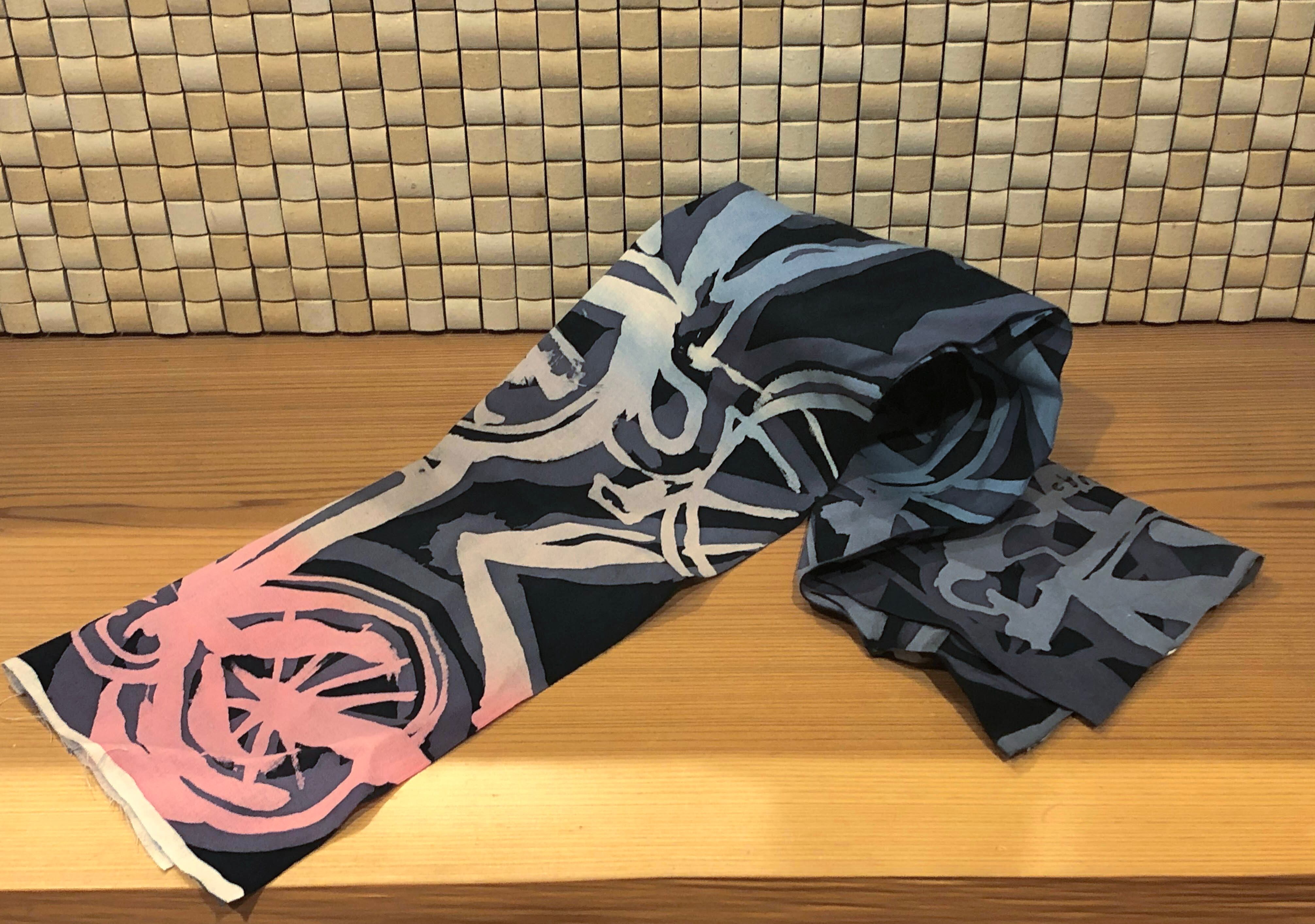 素材は綿で切りっぱなし、ロードバイクをモチーフに染めています