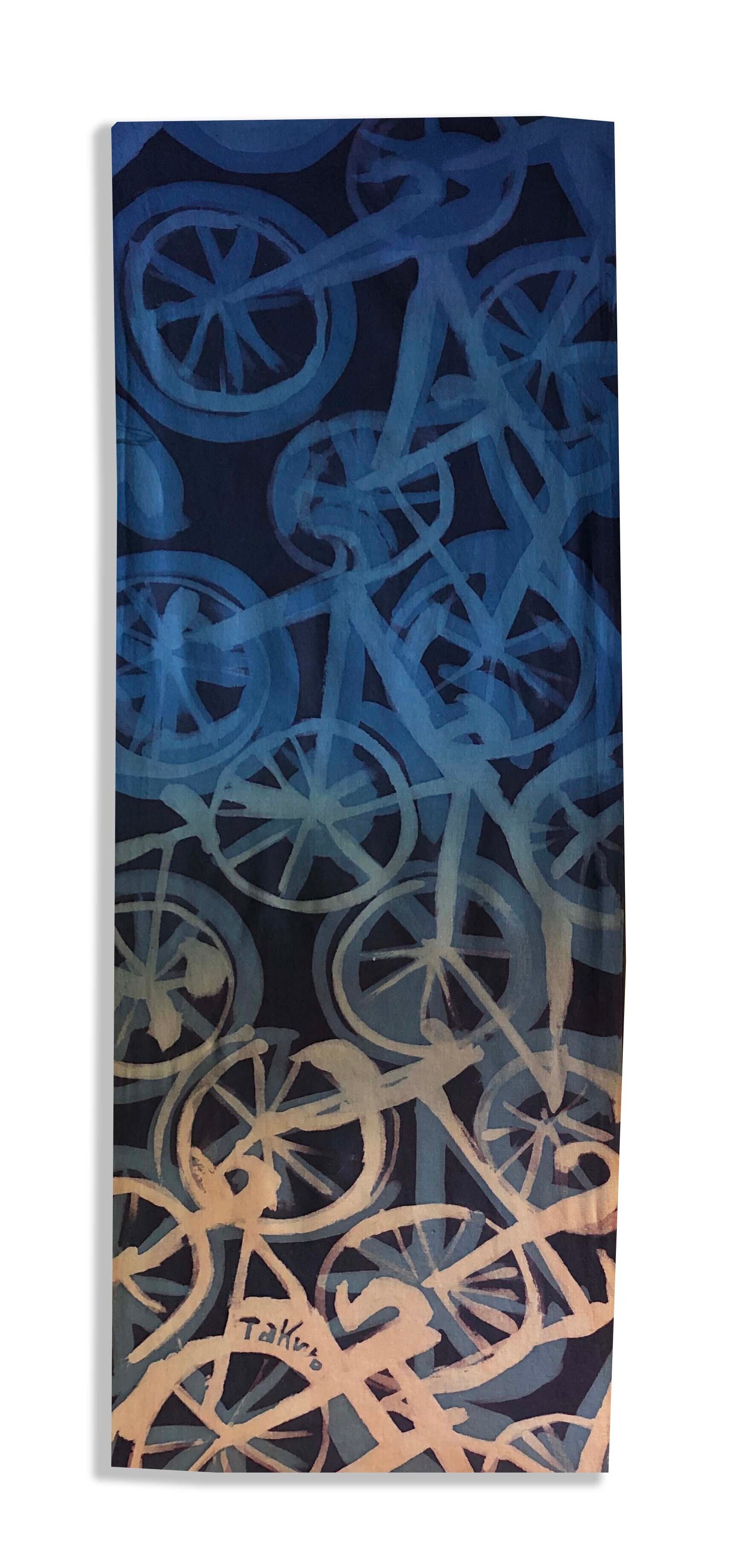 素材は綿で切りっぱなし、ロードバイクをモチーフに染めています