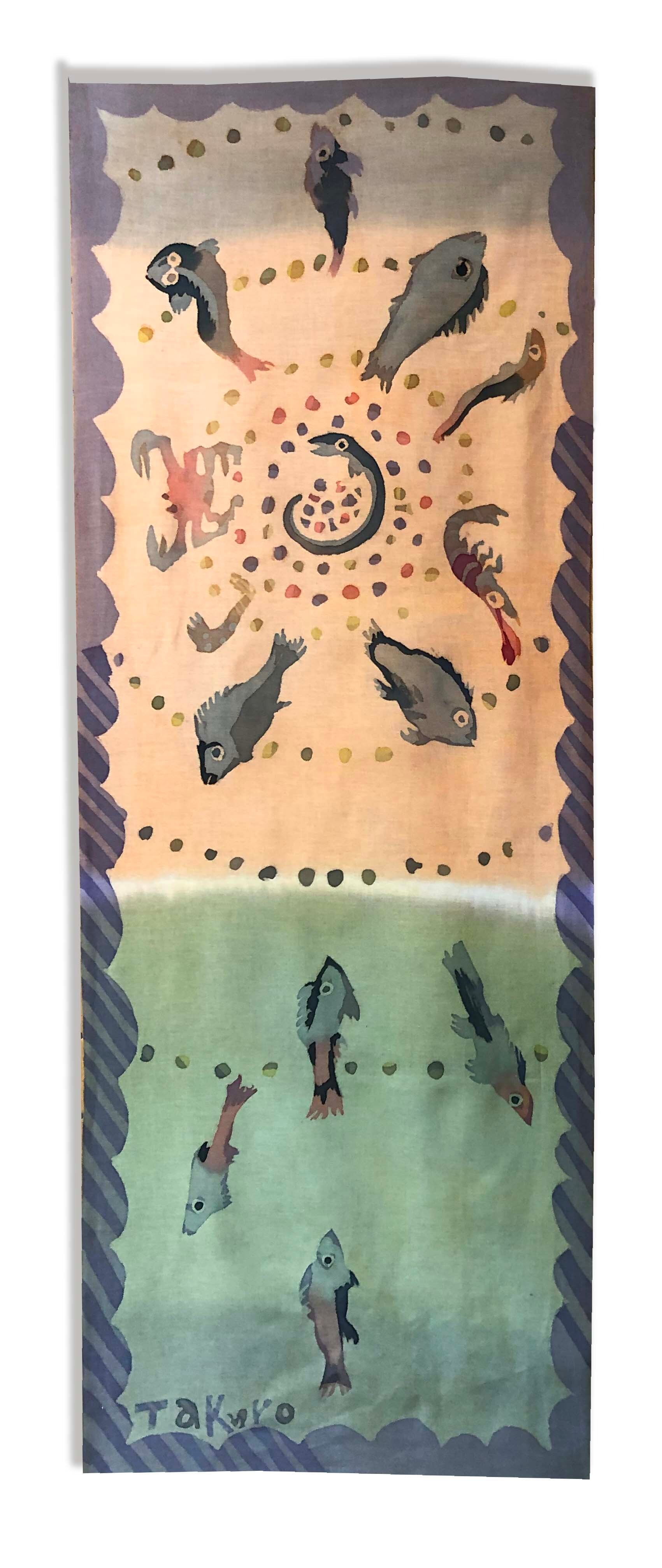 素材は綿で切りっぱなし、魚と花火をモチーフに染めています